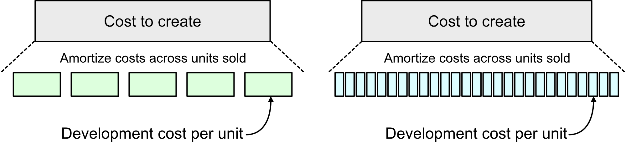 The discussion so far has been about the cost of the product - how long it takes to initially create a product, the cost of each additional unit of that product, the cost of each new variant of the product, and the development cost that must be borne by each unit sold.