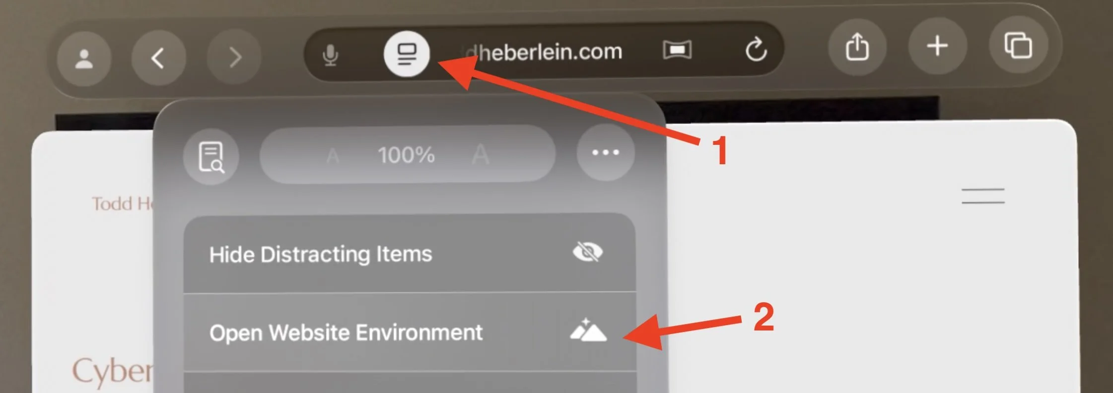 If you have an Apple Vision Pro, tap on the left button in the Safari address bar (1), and then select “Open Website Environment” (2). For a bit of fun, play the audio below while viewing the scene.